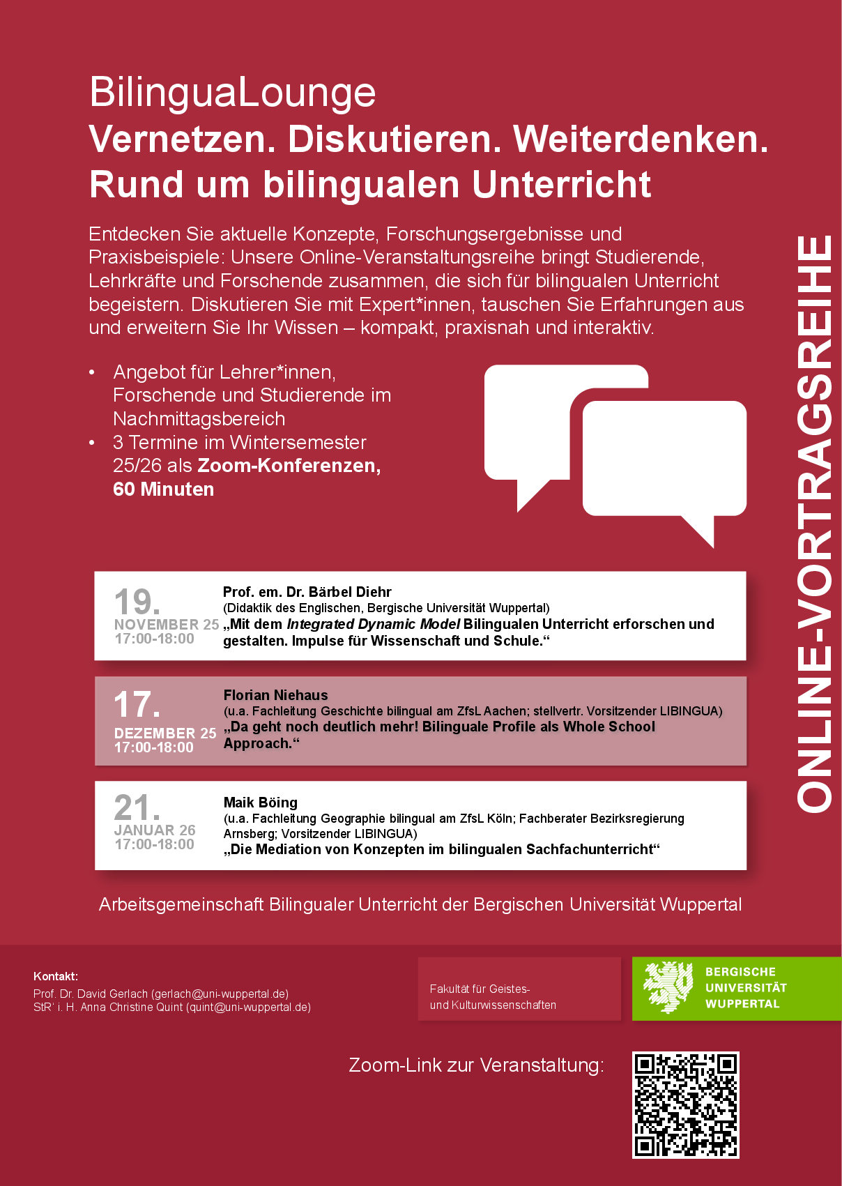 Im Wintersemester 2025/26 veranstaltet die Arbeitsgemeinschaft Bilingualer Unterricht der Bergischen Universität Wuppertal eine Online-Vortragsreihe. Herzlich eingeladen sind alle an bilingualem Unterricht interessierten Akteur*innen: Studierende, Forschende, Lehrende sowie allgemein am bilingualen Unterricht Interessierte. Das Online-Forum bietet nicht nur spannende Input-Vorträge basierend auf aktueller Forschung und Praxis, sondern dient zudem dem direkten Austausch zu Konzepten bilingualen Lehrens und Lernens.