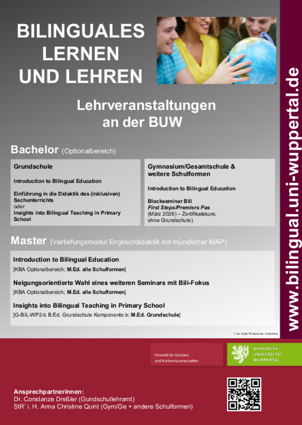 Der bilinguale Unterricht bereitet Heranwachsende auf die Herausforderungen des Lebens im 21. Jahrhundert vor. Dabei stehen die Anforderungen an die sprachlichen, fachlichen und interkulturellen Kompetenzen für das Sprachhandeln mit Partnern aus anderen Lebens-, Sprach- und Kulturkreisen im Mittelpunkt. In der Wuppertaler Didaktik des Englischen verstehen wir bilingualen Unterricht als Fachunterricht, der in zwei Sprachen durchgeführt wird und das Ziel verfolgt, eine doppelte Sachfachliteralität (Vollmer 2005) auszubilden und kulturbewusste Mehrperspektivität in fachspezifischen Zusammenhängen zu entwickeln (Diehr 2012). In der Forschung widmen wir uns daher vor allem den Fragen zum Kompetenzaufbau - speziell dem Aufbau der doppelten Fachliteralität - sowie den Unterrichtsarrangements, in denen sowohl die Fremdsprache Englisch als auch die Schulsprache Deutsch verwendet werden.