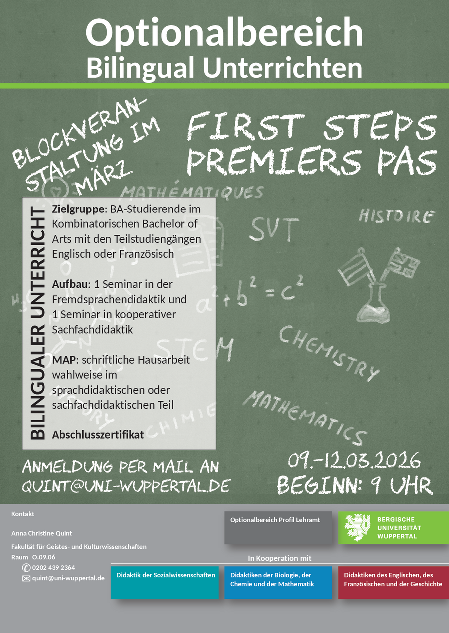 Die spezifisch bilingualen fachdidaktischen Veranstaltungen werden von Lehrenden angeboten, die sich in Forschung, Lehre und Praxis intensiv mit den Besonderheiten des bilingualen Lernens und Lehrens auseinandersetzen. Sie konzipieren theoriebasierte und gleichzeitig praxisnahe Lehrveranstaltungen. Dabei können sie auf eigene Erfahrung im Bereich des bilingualen Unterrichtens zurückgreifen.